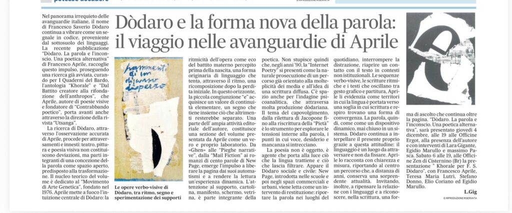 Giovedì 4 dicembre presentazione del volume “Dòdaro. La parola e l’inconscio: una poetica alternativa” a cura di Francesco Aprile (Vita nostra edizioni, Roma, collana extraVaganti, a cura di Paolo Allegrezza, 2025) presso Officine culturali Ergot, Lecce, piazzetta Falconieri, a partire dalle 19:00. Un viaggio a partire dai testi e dalle opere verbovisive di Francesco Saverio Dòdaro: poeta, scrittore, teorico dell’arte, operatore culturale. Interventi di Lara Gigante, Massimo Pasca, Egidio Marullo. “Estratto da: DÒDARO F. S., Joe Cooker, in Pieghe Narrative, Lecce, Conte Editore, 2001.””Ho bruciato il dizionario.Duemila pagineOttantamila voci.Una sola parola, tutto il resto una metafora”ExtraVaganti è una nuova collana ideata da Antonino Saggio e Paolo Allegrezza, diretta da quest’ultimo e dedicata ad autori la cui opera è nel segno della sperimentazione e della contaminazione dei linguaggi. Francesco Saverio Dòdaro (1930–2018), tra i protagonisti della poesia visiva e concreta fin dagli anni Settanta. Teorico di arte e letteratura, narratore, operatore culturale, ha animato riviste e iniziative proponendo nuove modalità di ricezione del libro e riflettendo sulle condizioni della comunicazione. Il suo lavoro si distingue per la costante ricerca e ibridazione dei linguaggi, con una lettura in chiave psicoanalitica, in particolare della lezione di Lacan, rara nelle esperienze d’avanguardia coeve. Con la fondazione del movimento di “arte genetica approfondisce il tema della consumazione del linguaggio e della ricerca di nuove possibilità di significazione. Un impegno non elitario, ma aperto alla ricezione, radicato nel Salento e proiettato in una dimensione internazionale.